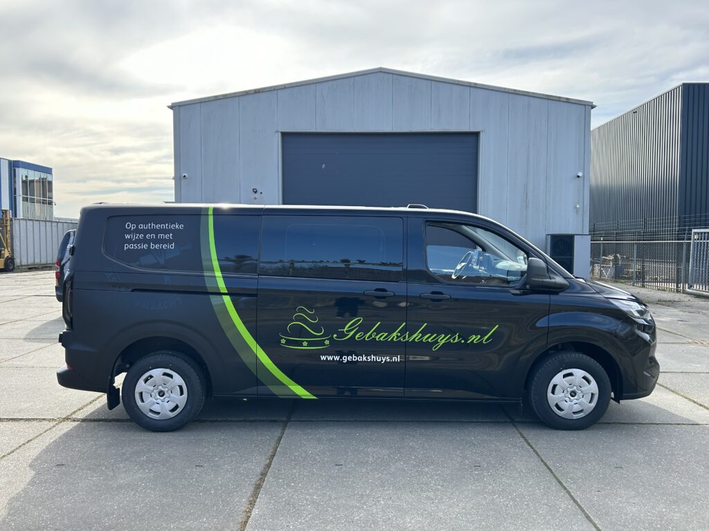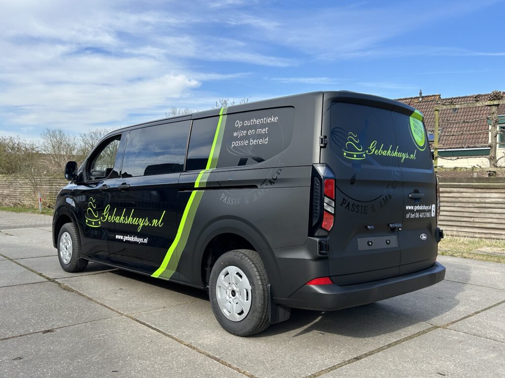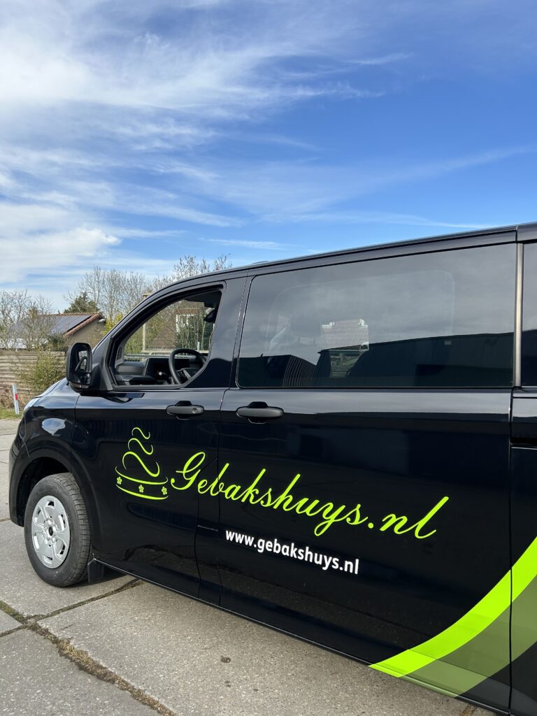 De lekkernijen van Gebakshuys worden in stijl bij de klant afgeleverd met deze mooie belettering.